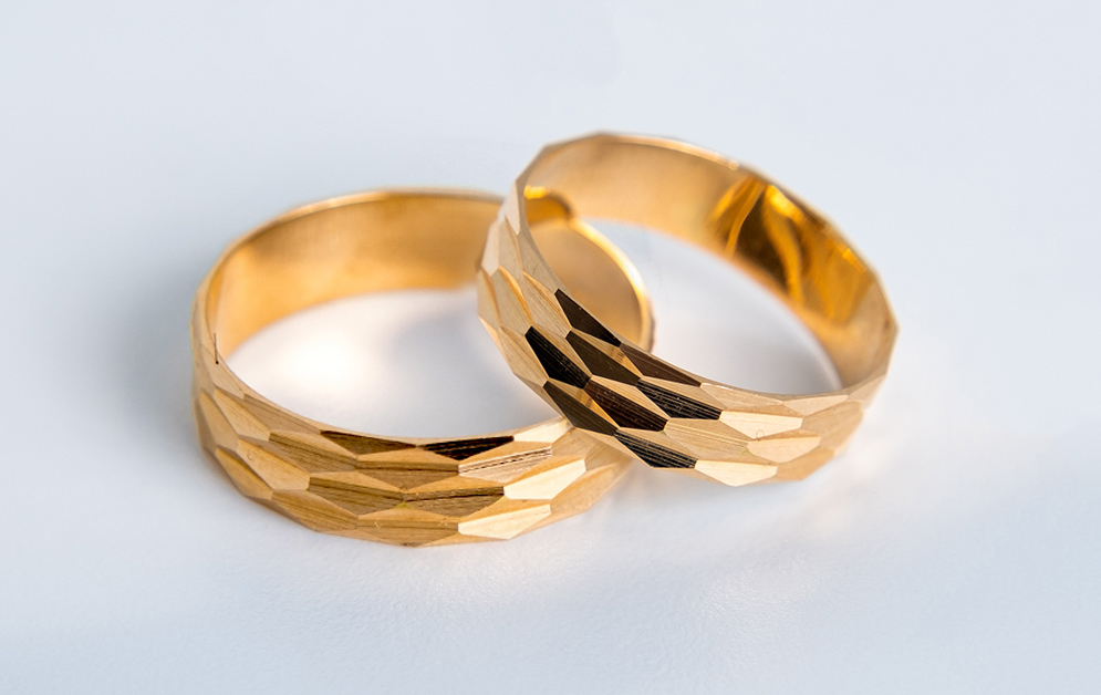 - Modelo: Argollas de matrimonio Rombos (diseño facetado/texturizado).