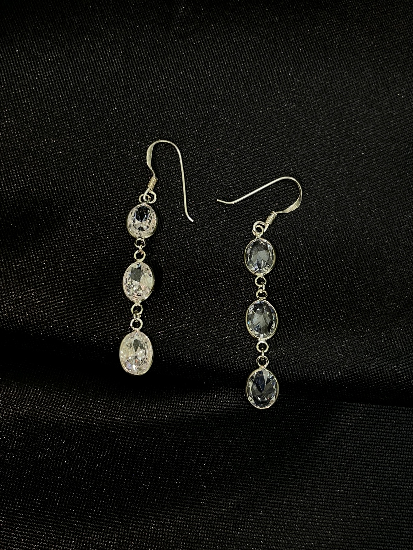 - Trío de Cristales Brillantes: El punto focal de cada aro son tres cristales brillantes de alta calidad, engastados de forma lineal. Estos cristales están facetados para maximizar su refracción de luz, aportando una luminosidad concentrada y elegante.
