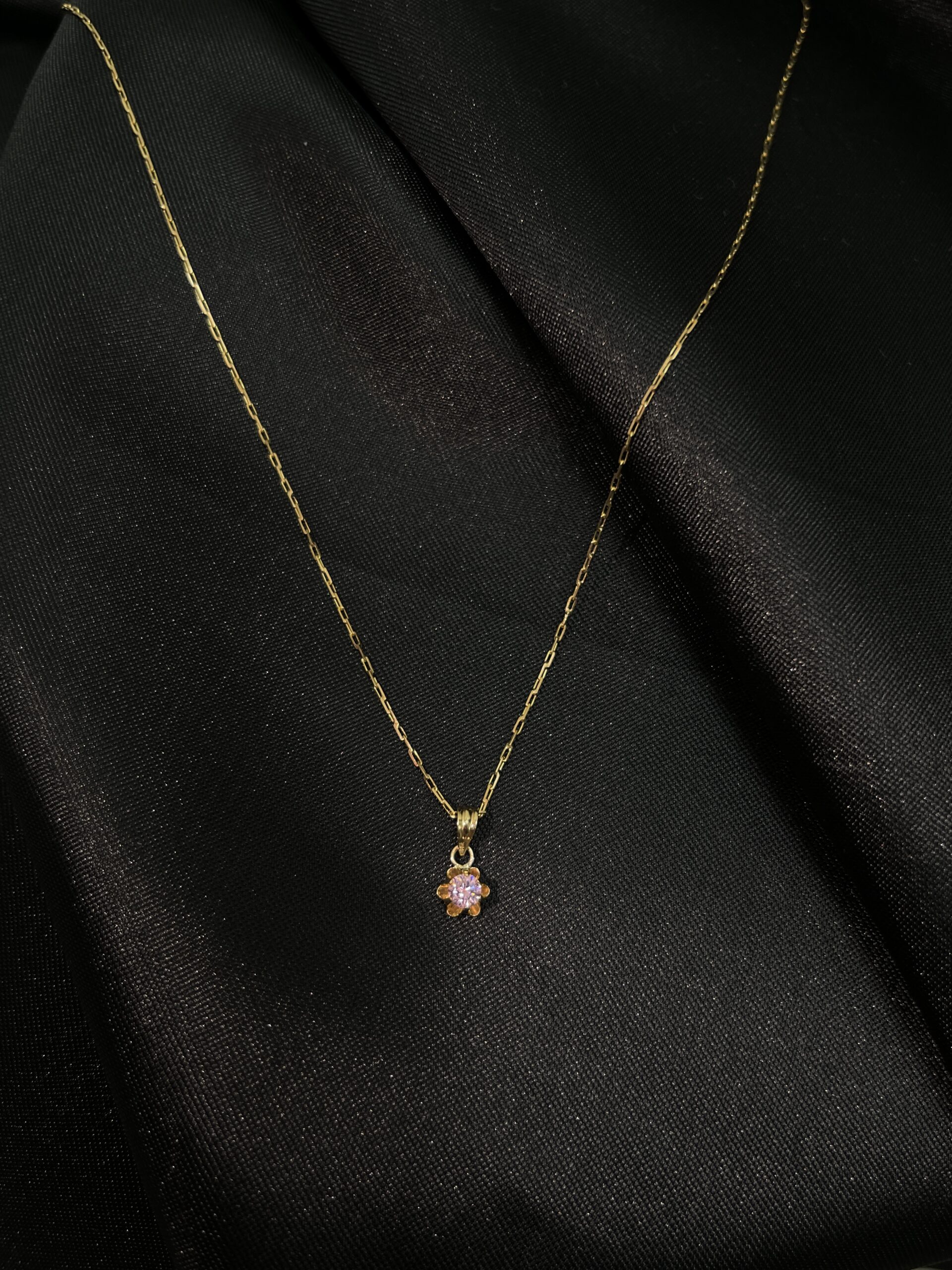 - Colgante de Flor Escultural: El punto focal es una flor con delicado diseño. Sus pétalos, meticulosamente trabajados en oro pulido, enmarcan con elegancia la gema central, creando una silueta orgánica y atemporal.