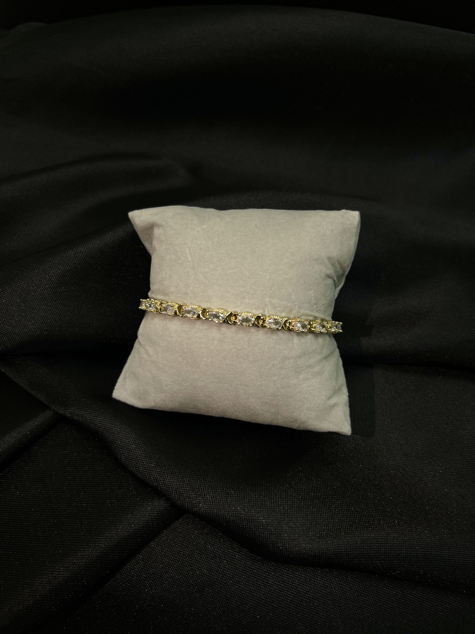 - Constelación de Circones Brillantes: La característica principal es un despliegue ininterrumpido de circones cúbicos (circonitas) de alta calidad, meticulosamente engastados a lo largo de toda la longitud de la pulsera. Estas gemas, seleccionadas por su claridad y brillo superior, capturan y reflejan la luz con un destello deslumbrante.