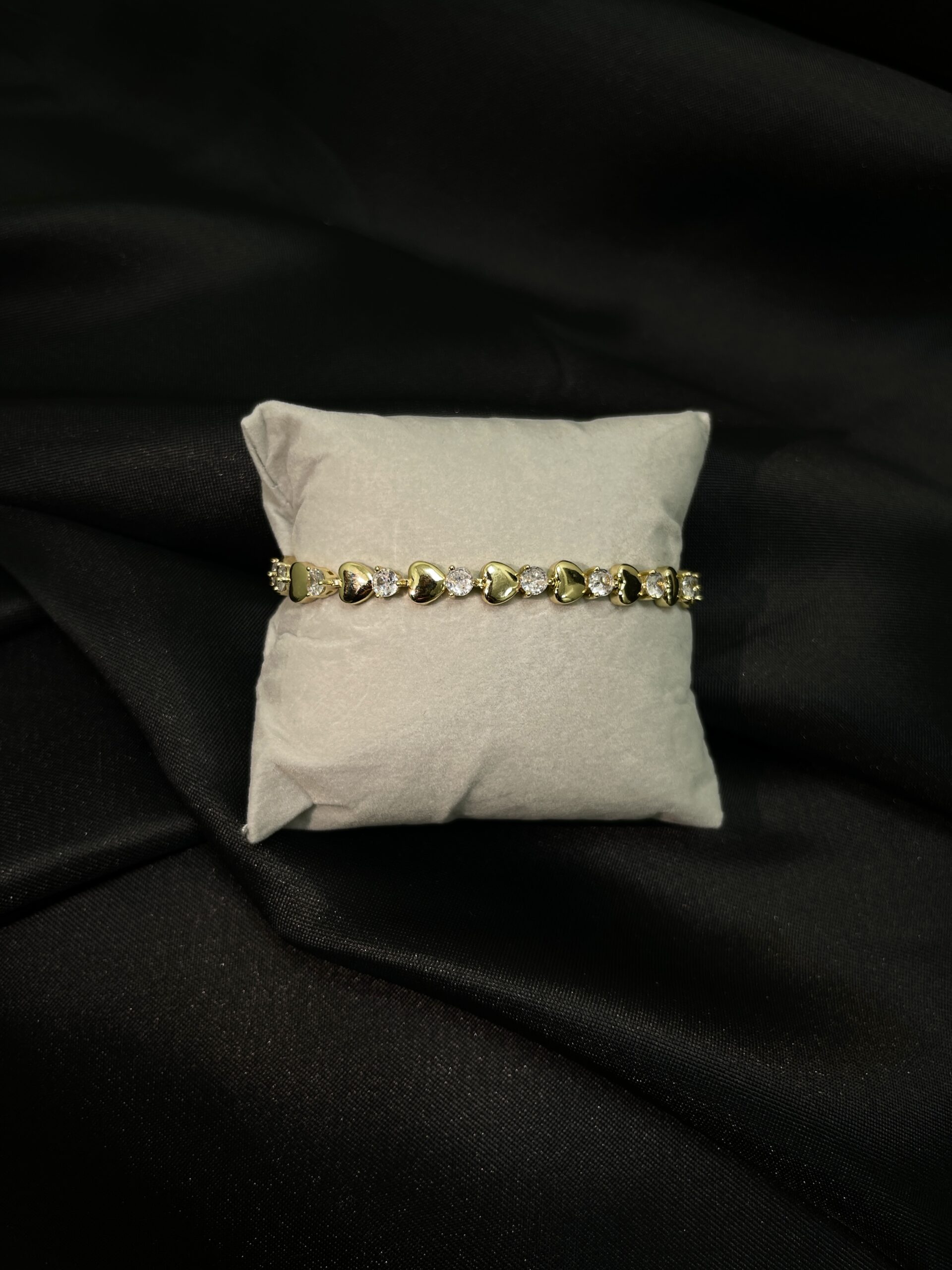 Esta pulsera es una declaración de amor y elegancia, combinando la calidez del oro con el brillo eterno de los circones en un diseño que captura el romanticismo.